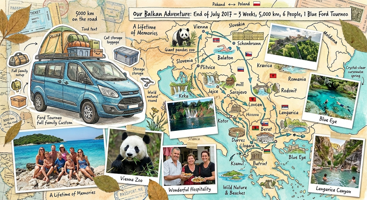 At the end of July 2017, we set off on our biggest trip yet – a three-week road trip through the Balkans. Our route took us through seven countries: Poland, Czech Republic, Hungary, Bosnia and Herzegovina, Montenegro, Albania, Croatia, and Austria. Our blue Ford Tourneo Custom was packed with a tent, storage boxes, and the whole family of six.